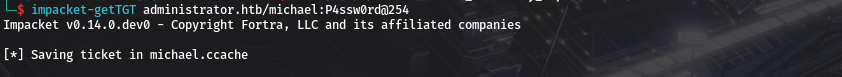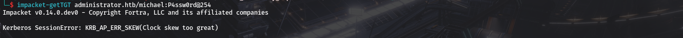 in This example ill be using htb’s Administrator machine and from running a command to ask for kerberos ticket we are met with the error Kerberos SessionError: KRB_AP_ERR_SKEW(Clock skew too great) As we can see trying to ask for ticket as michael backfires because of the clock skew issue.