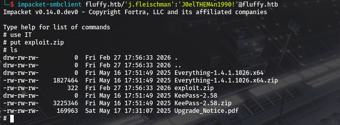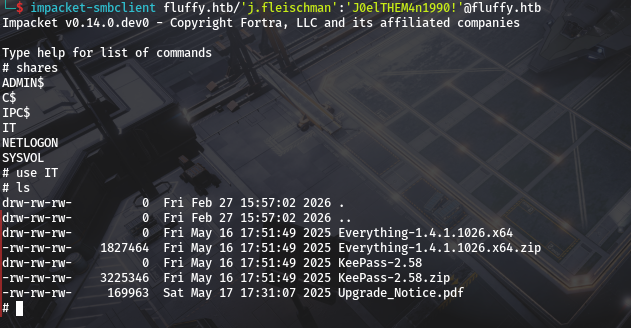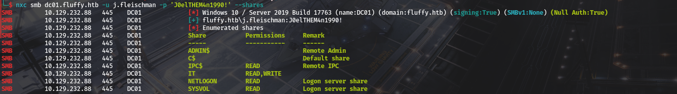 As is common in real life Windows pentests, you will start the Fluffy box with credentials for the following account: j.fleischman / J0elTHEM4n1990!