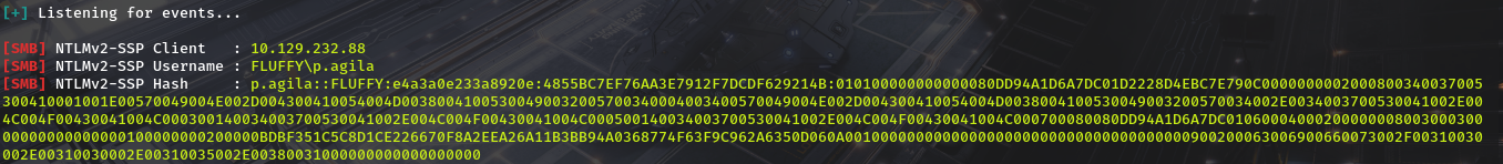 [*] Got hash for 'administrator@fluffy.htb': aad3b435b51404eeaad3b435b51404ee:8da83a3fa618b6e3a00e93f676c92a6e